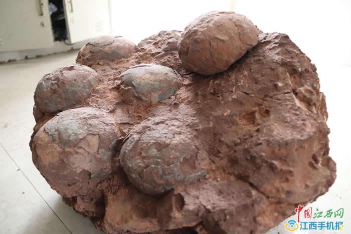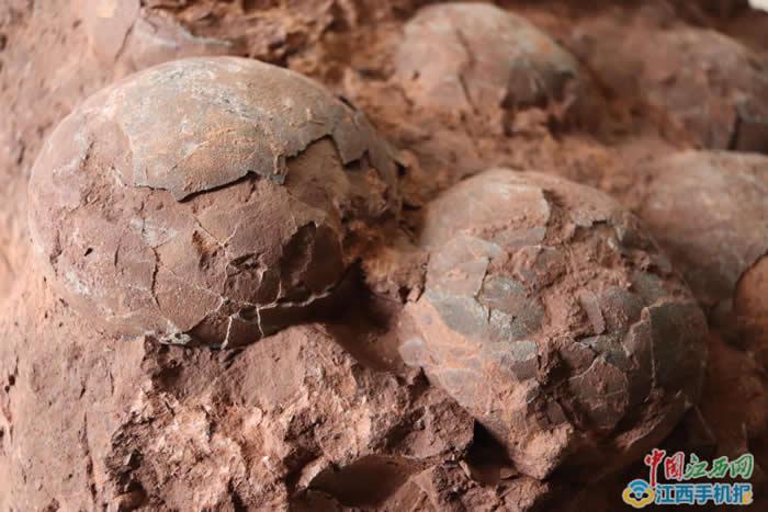 接到消息后,萍乡博物馆也立即派专业人员前往现场查看,证实这些椭圆形的石头为恐龙蛋化石。5月14日,中国江西网记者在萍乡博物馆看到,恐龙蛋化石裸露在外的蛋壳表面有多处碎裂,表面凹凸不平,损坏较为严重。顺着石块表面的蛋痕数过去,这块石头内有6枚恐龙蛋化石。