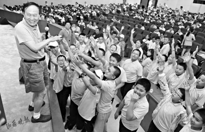 由于时间有限,并不是每个人都有机会提问,因此在提问环节快结束时,现场出现了“难以控制”的局面,小学生纷纷拥到讲台下方,争先恐后地举手提问。“我,我,我……”的声音此起彼伏,大家都踮着脚,尽最大的努力将手举高,希望下一个叫到的是自己。