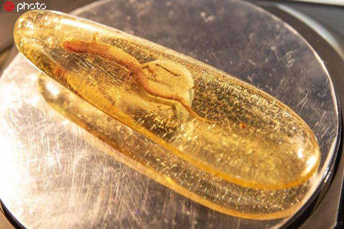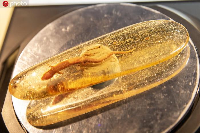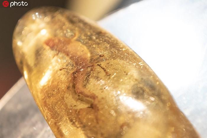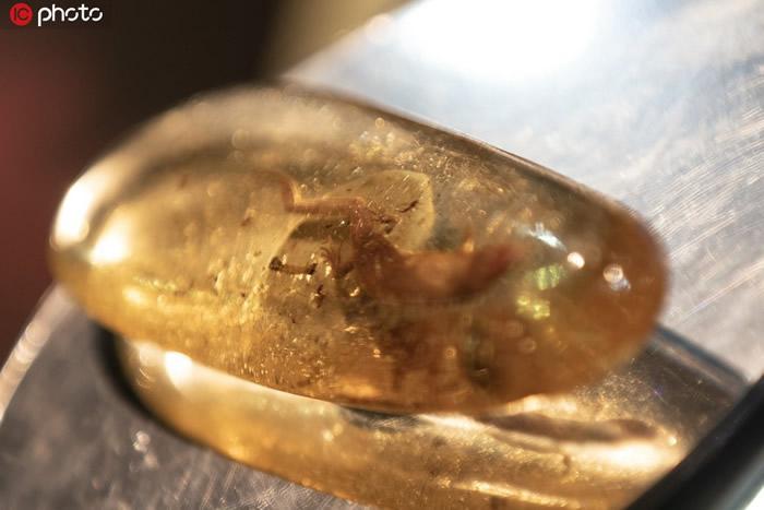 (化石网报道)据/IC photo:2019年11月6日,中国上海,2019第二届中国国际进口博览会(上海进博会)在沪举行。 2019上海进博会珠宝展,世界最大琥珀水胆蜥蜴化石亮相,腹中水胆清晰可见。稀世珍宝,全球唯一的琥珀蜥蜴。