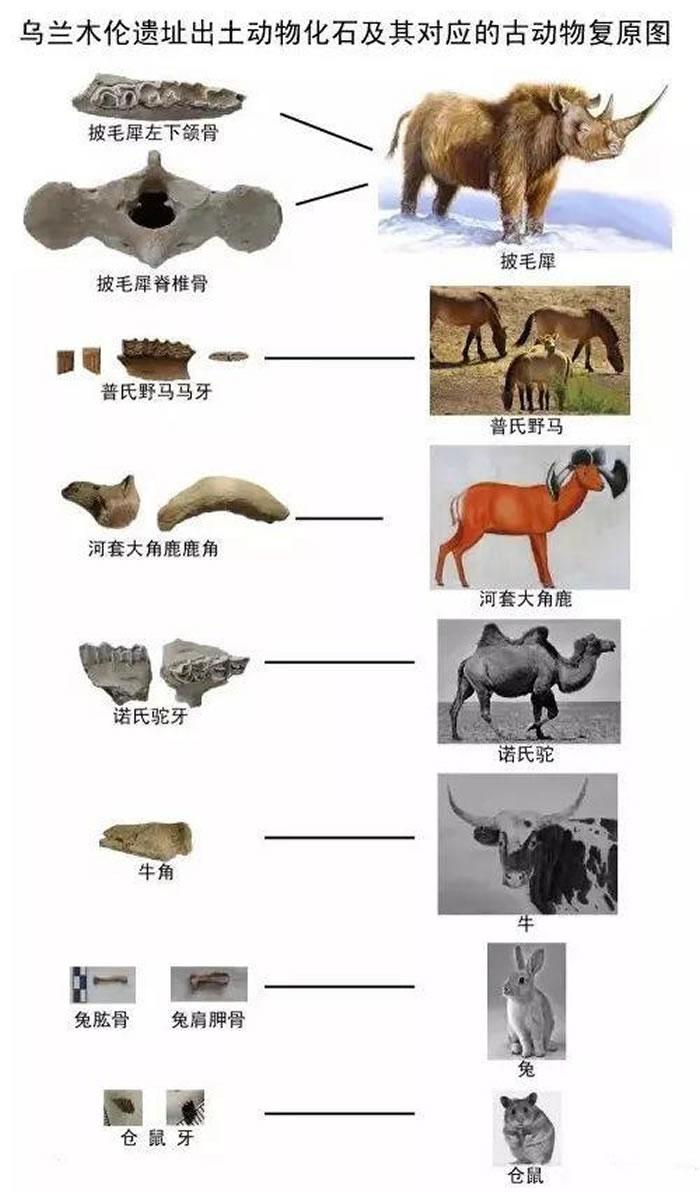 乌兰木伦遗址出土的动物化石及其对应的古生物复原图