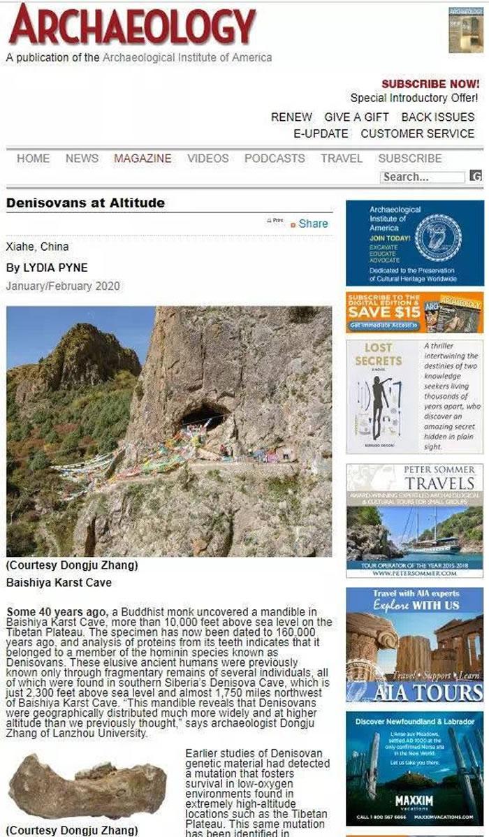 甘肃夏河白石崖溶洞丹尼索瓦人化石入选《Archaeology》2019年度世界十大考古发现