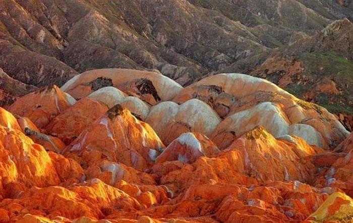 由色彩斑斓的褶皱泥岩和砂岩组成的彩色丘陵是地质公园最显著的特征。此外,还拥有自然侵蚀在山体上形成的“窗棂状”和“宫殿式”地貌,是中国丹霞地貌的最佳代表。古代洋壳残余“九个泉”蛇绿岩套是这里的另一个重要特征,其国际地质意义被众多地质学家所研究。