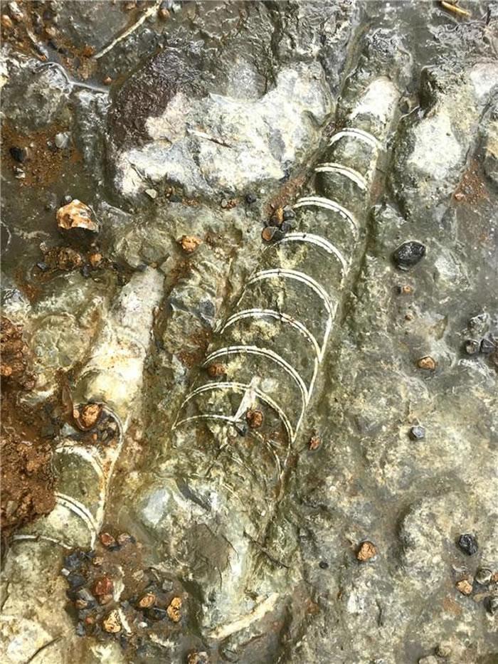 然而,就在这块数百平方米的石板剖面上,仅从没有被泥土覆盖的部分查看,就发现地表分布着数十处明显可见的化石群。经专家现场认定,这里分布的化石主要为角石,大大小小的很多,外形酷似竹笋,最长的五六十厘米,最短的数厘米。另外,现场乱石中还发现有珊瑚化石、腕足类化石等。