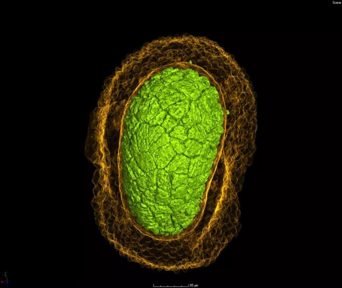 化石产自我国陕西西乡县寒武纪底部宽川铺组钙质磷块岩,通过酸处理岩石获得立体标本后,研究人员就像医生给患者做CT扫描一样,采用高分辨率X射线显微断层成像技术扫描了标本,并借助计算机后期三维重构,可视化展示了化石的立体结构细节,即化石由发育了瘤状表面装饰的厚壁囊包(图中呈橙色透明状)和内部分裂的细胞团(图中绿色不透明部分)组成。