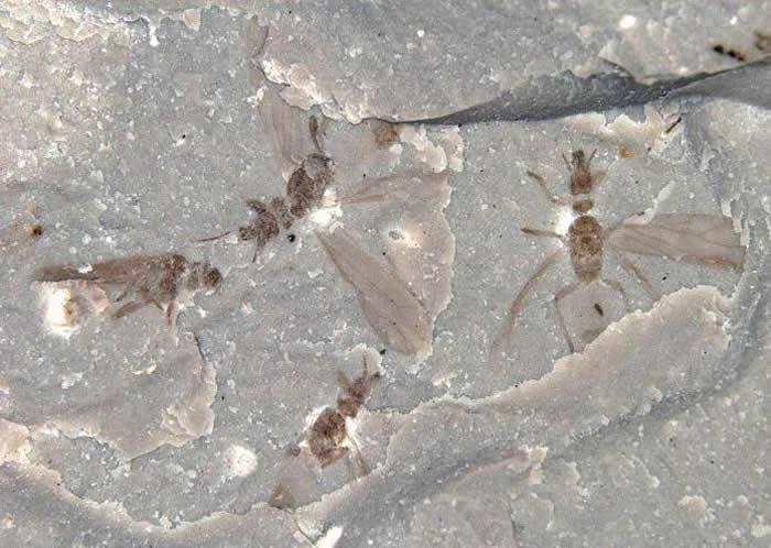 这是一群栩栩如生的古蓟马化石,被1.6亿年前细腻的火山灰掩埋。它们振翅欲飞,却难逃厄运。本图展示了岩石劈开时的原貌,古蓟马的身体一部分露出,一部分盖在凝灰岩之下。进行科学研究则需要在高倍显微镜下用极小的刀片细心的剥离盖住的岩石,从而展现昆虫全貌。