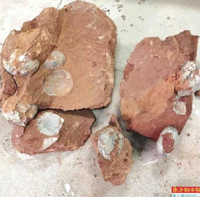 杜衍礼介绍,今年5月底,河源市江东新区临江镇联新村一处正在施工的红砂岩山坡上,有人发现疑似零散的恐龙蛋化石。随后,当地派出所收缴部分恐龙蛋化石及碎片送往河源恐龙博物馆。
