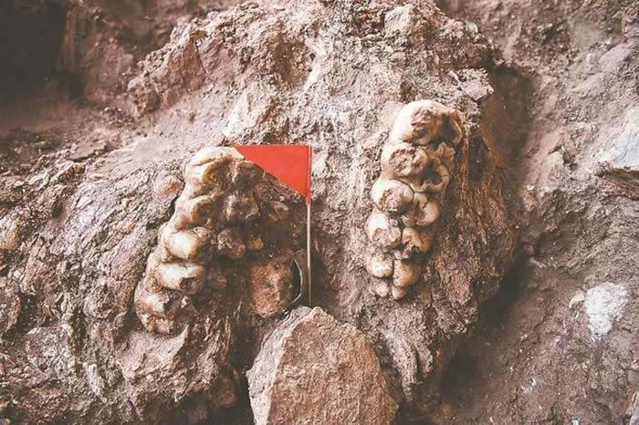 本次发掘利用航拍、全站仪等最新的科技手段,对人字洞遗址本体的原生堆积开展细致的考古学发掘,在地层中采集了十余件珍贵的人工石制品,发现一具成年个体中华乳齿象的门齿、下颌骨、前肢骨、掌骨和指骨化石,这是人字洞遗址首次发现成年个体的象类骨架化石;在中华乳齿象的旁边还暴露出一具保存较为完整的剑齿虎头骨、下颌骨和头后骨骼化石。此外,还采集到异常丰富的小哺乳动物化石,尚待鉴定。