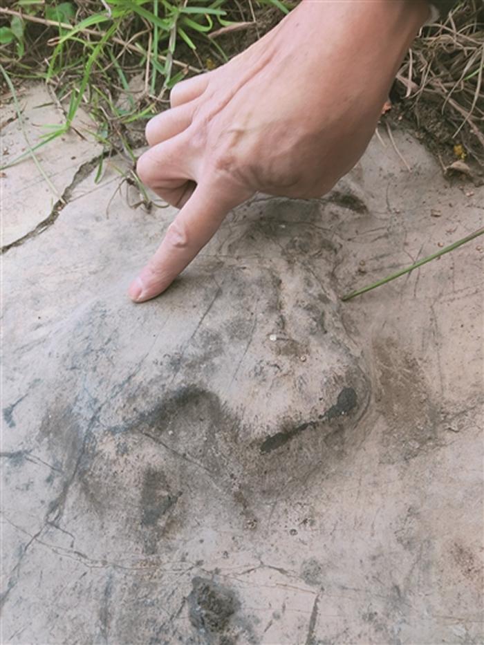 到了目的地,记者跟着该村的村主任陈恩详和支书一同去往发现古生物脚印化石的地点,下车后步行十多分钟路程便到了一座名为将军山的山脚,那些古生物化石足迹就在此被发现。