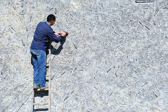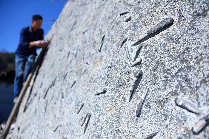 (化石网整理)据人民网(王俊/摄):2020年11月12日,湖北省宣恩县农民汤水平在打磨“震旦角石”。湖北省恩施土家族苗族自治州宣恩县农民汤水平历时两年多时间,开采、打磨出一块高3米、宽5.06米、重约11吨的“震旦角石”。这块古生物化石上有800多只4亿多年前软体动物形成的化石,经过精雕细琢后集体呈现在一面15米宽的长方形巨石上。