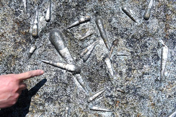 800只4亿年前软体动物“震旦角石”化石在11吨巨石上“集体亮相”