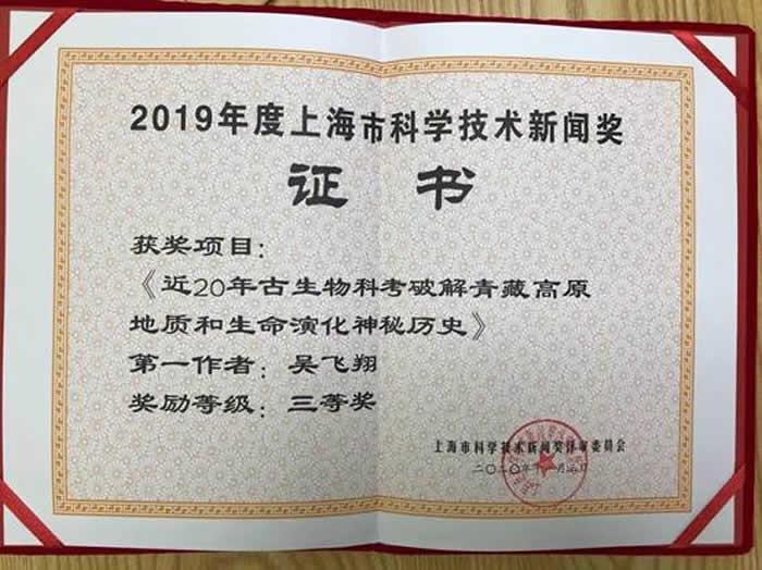(化石网整理)据中国科学院古脊椎动物与古人类研究所:11月26日,2019年度上海市科学技术新闻奖颁奖仪式上,古脊椎所邓涛研究员、吴飞翔副研究员等在《文汇报》发表的专版“近20年古生物科考破解青藏高原地质和生命演化神秘历史”荣获2019年度上海市科学技术新闻奖三等奖。