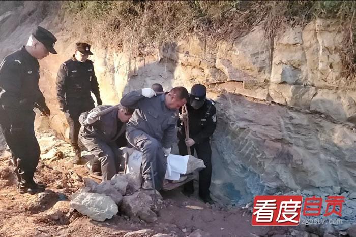 12月23日上午开始,自贡恐龙博物馆的专业人员对这一恐龙化石进行了挖掘。由于此处岩石硬度较高,化石又是纵向处于岩石内部,发掘难度较大。但出于安全考虑,专家决定将发掘工作抢抓在当天完成。通过电镐粗挖外围、錾子细作周边等方式,到傍晚6点,这块恐龙化石终于与周边的岩石彻底分离,并基本完好无损。现场发掘人员在大山铺派出所干警的协助下,多人合力抬起了这块重约三四百斤的恐龙化石,并很快安全运抵自贡恐龙博物馆。