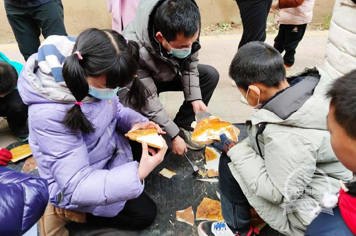 活动中,西北大学地质系古生物学与地层学硕士、陕西省科普大使白琳老师,给孩子们讲解了人类进化史,让青少年了解地球46亿年的前世今生及地球生命的进化史。白老师还着重讲解了寒武纪到第四纪人类史的衍变过程,让孩子们更生动地学习各种化石知识,了解挖掘化石的过程。在随后的动手实践环节,白老师带领孩子们开展了一场化石勘探实践,孩子们亲自把老师带来的化石砸开,看到了里面的小虫、植物标本,都非常惊奇。