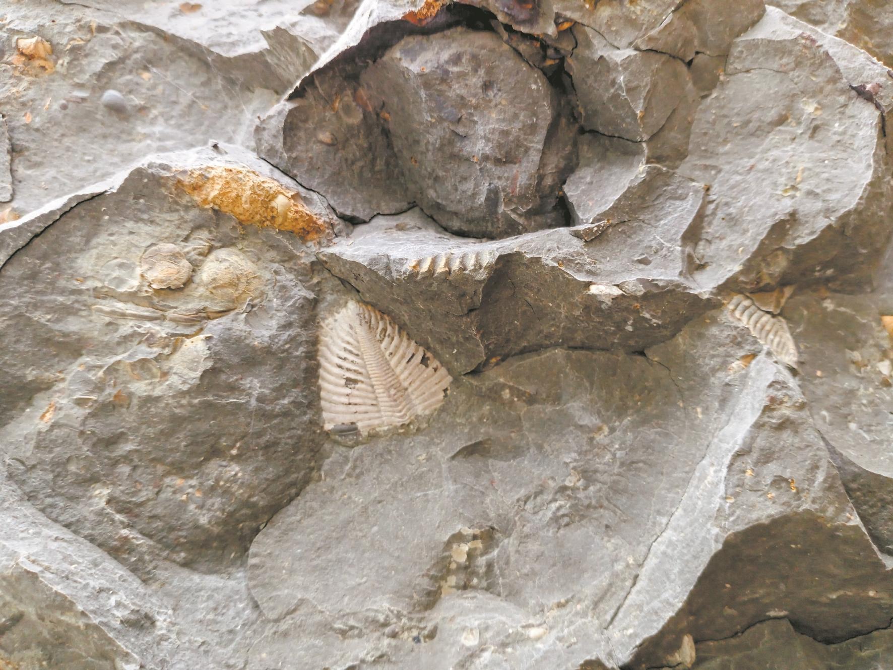 极目新闻记者看到,山体岩石上的深色化石清晰可见,有的在岩石表面,有的在石缝中,上面虫类的纹路十分明显。