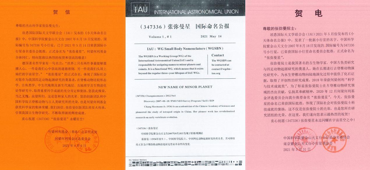 小行星是目前各类天体中唯一可以根据发现者意愿进行提名,并经国际组织审核批准从而得到国际公认的天体。小行星命名是一项国际性、永久性的崇高荣誉,必须得到国际小行星命名委员会的审批,命名一旦获国际组织批准,将成为该天体的永久星名,并被世界各国所公认。张弥曼院士因其卓越科研成就荣获何梁何利基金2018年度“科学与技术成就奖”,2020年12月被何梁何利基金会推荐为国际小行星命名的候选人,于2021年5月14日荣获批准。以她的名字来命名永恒的行星,体现了国际社会对张弥曼院士学术成就与科学精神的褒奖与发扬,也是对从事古脊椎动物与古人类学研究工作者极大的精神鼓舞。