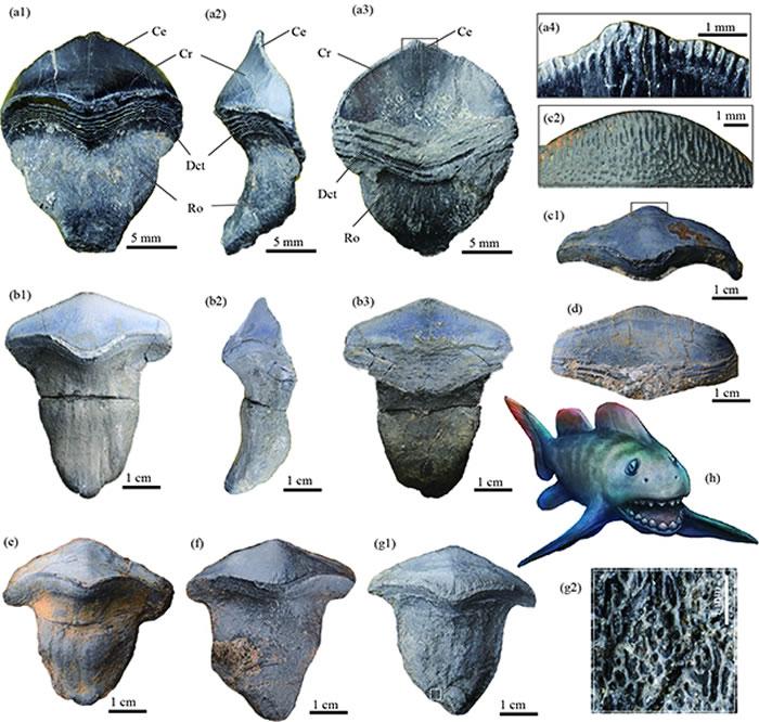 山西阳泉太原组钱石灰岩里的史前巨鲨—瓣齿鲨的牙齿化石(盖志琨摄,杨定华绘制复原图)