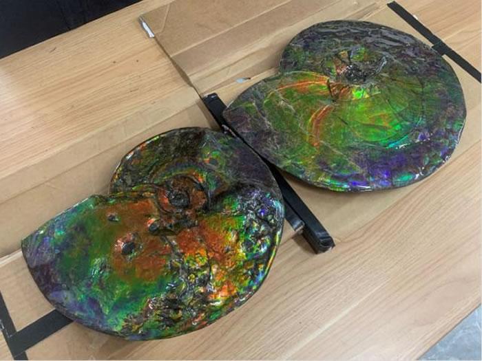 经开箱查验,关员发现包裹内的物品为2块有动物纹路的圆盘状石头,颜色绚丽,呈现出红色、绿色和蓝紫色等多种颜色,还有“龙鳞状”的碎裂结构,与一般玻璃工艺品差距较大,疑似古生物化石。经鉴定,确认这2件物品为古生物化石制品。