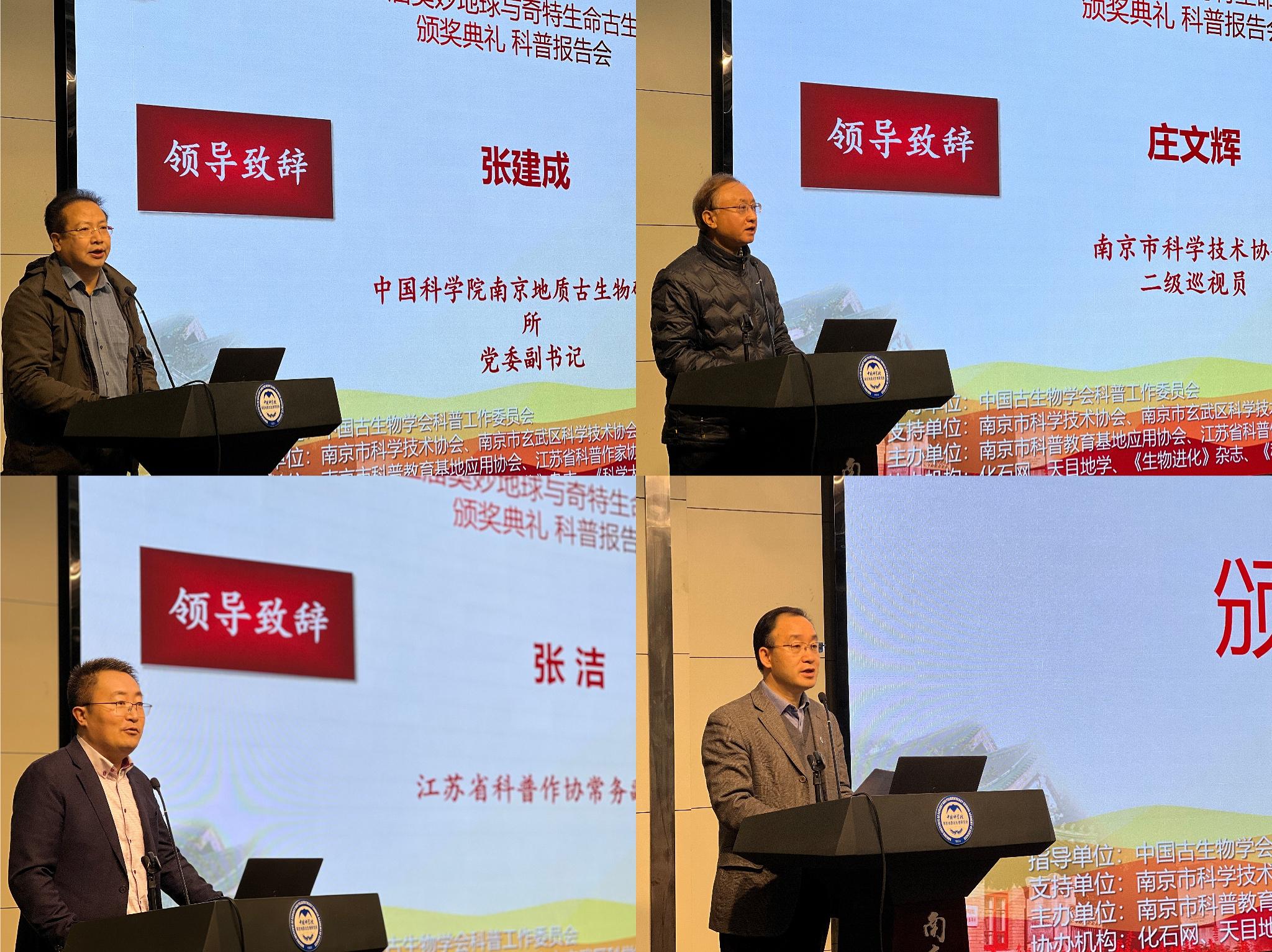 张建成、庄文辉、张洁和王永栋分别代表南京古生物所、南京市科协、江苏省科普作家协会和南京古生物博物馆致辞,各位对第十三届奥妙地球与奇特生命古生物绘画大赛活动的举办均给予积极评价,指出活动的举办进一步推进广大学生和化石爱好者对地球和生命演化历史的了解,激发公众对自然的热爱和保护,并对获奖的同学和指导老师表示热烈祝贺,