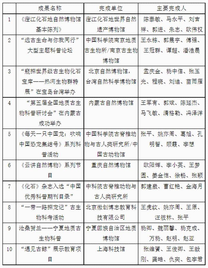 2020年度全国地质古生物科普十大进展分别为:澄江化石地世界自然遗产博物馆“澄江化石地自然博物馆基本陈列”、中国科学院南京地质古生物研究所/南京古生物博物馆“远古生命与你我同行”大型主题科普论坛、北京自然博物馆与台湾自然科学博物馆“窥探世界级古生物化石宝库——热河生物群特展”在宝岛台湾举办、内蒙古自然博物馆“第五届全国地质古生物科普研讨会”在内蒙古成功举办、中国古动物馆“《每天一只中国龙:吹响中国恐龙集结号》系列科普活动”、重庆自然博物馆《云讲自然博物》系列节目、中科院古脊椎动物与古人类研究所《化石》杂志入选“中国优秀科普期刊目录”、北京微创博志教育科技有限公司“一带一路探龙记”古生物科考活动、宁夏回族自治区地质博物馆“沧桑贺兰——宁夏地质古生物科普”以及上海科技馆““遇见古鲸”展示教育项目”。