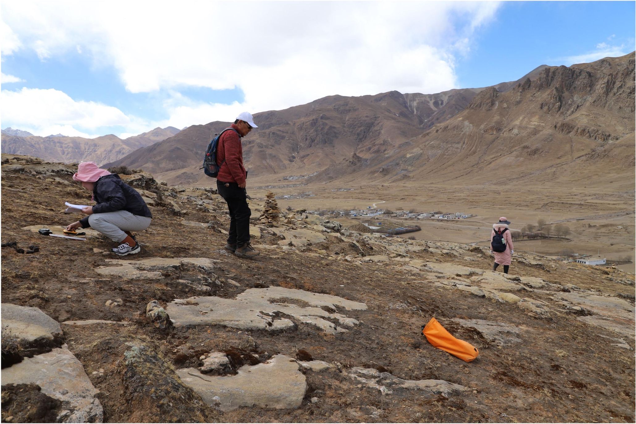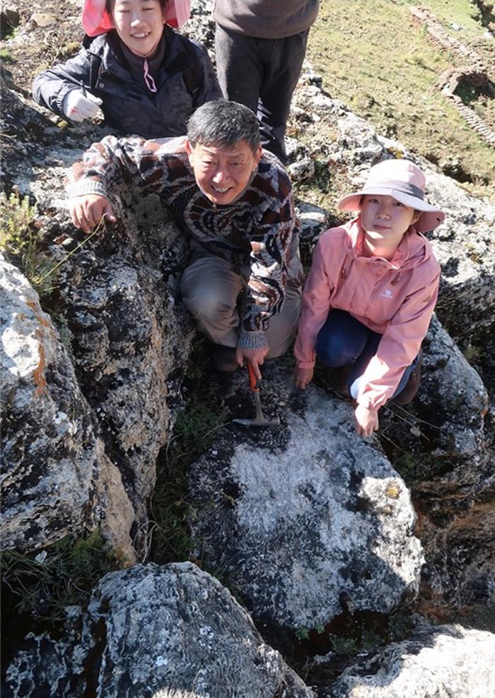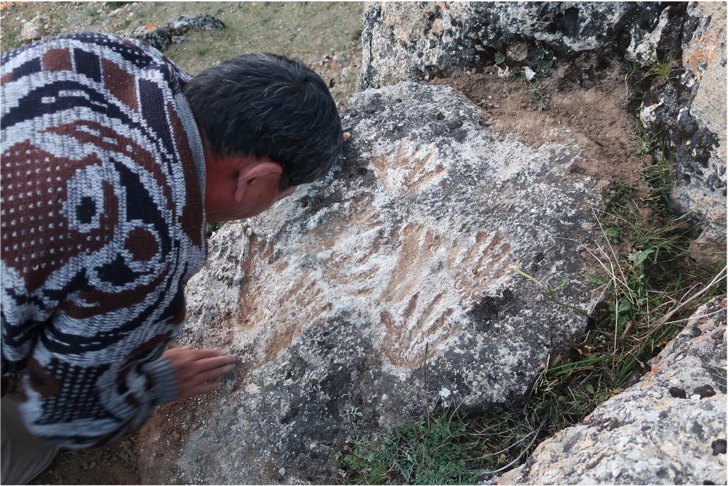 章典:2017年底我辞去港大地理系系主任的职务,到广州大学地理科学与遥感学院任教,2018年作为中国科学院青藏高原所客座研究员参加了第二次青藏高原综合科学考察,那年春天,我和中科院的合作伙伴陈发虎院士团队又去了邱桑温泉,在距离最初发现点十几米的石头上,又发现了几个新的手脚印。当年夏天,我和广州大学团队成员王蕾彬、王晓晴上高原继续考察时,村委会的人说还有其他手脚印,叫了一个知道地点的村民带我们去。