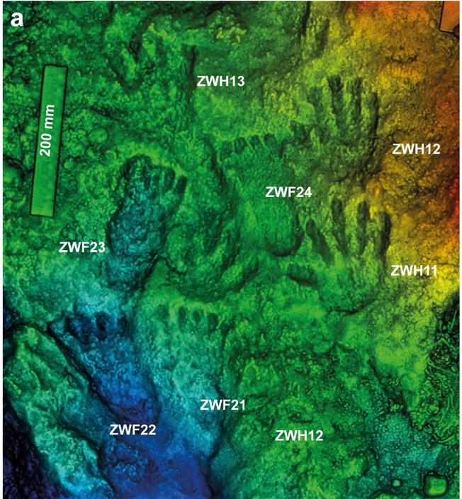 对形态和组成的分析可以观察到一些“有意识”的现象,印迹形成的图像在空间上排列有序;手指和脚趾的指向均一致;用力均匀以使所有手脚掌形态保持完整;在脚印编号ZWF23上还清楚地表明脚印有意地精确重叠;ZWH3手指的旋转和ZWF24脚后跟的有意用力;按空间大小调整手指的张开程度,ZWH1和ZWH14有意增大张开程度;手脚印距离的保持和尽量避免交叉的行为,你能想象出古人类从选择右手和脚,到将创作原型定位到可用空间的过程,以及提前对印迹的整体构成进行了深思熟虑的设计。