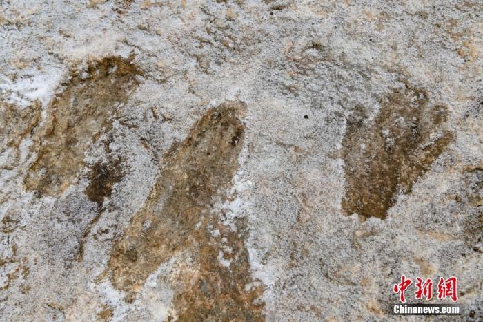 图为1月19日拍摄的西藏拉萨市堆龙德庆区德庆乡邱桑村邱桑温泉石灰岩上的“古人类手脚印”。中新社记者 贡嘎来松 摄
