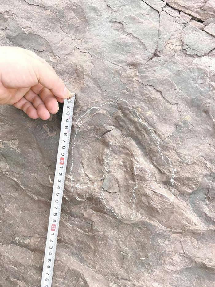 据称,该月21日,倪父和儿子一起,在中国地质大学(北京)的邢立达课题组、地质与古生物专家张显球等专家学者的共同勘察下,对已暴露的恐龙足迹及其岩层层面进行了详细研究,并利用无人机,立体扫描等手段记录了足迹状况。经研究,该区域地层属于白垩系闸岗群马屋组,时代为早白垩世晚期–晚白垩世早期。