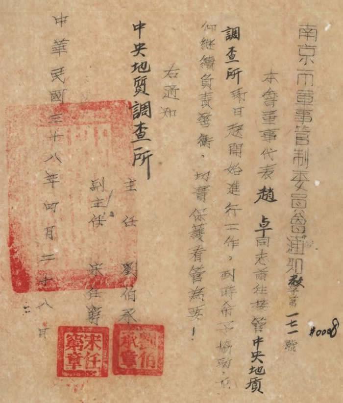 1949年4月23日,南京解放。4月28日,南京市军事管制委员会正式通知派军事代表赵卓前往接管中央地质调查所(图1,档案S005-00013-017)。根据一份1949年8月24日发出的“工作总结表格”可以看出(档案S005-00002-002),5月初,南京市军管会财政经济委员会(?)军事代表浦继五曾经到过中央地质调查所宣布接管。5月9日,中央地质调查所召开解放后的第一次所务会议,讨论各室馆移交清册、编制等问题,关于研究费预算、不在京人员维持费等问题,作出决议提请浦代表来决定。但不久,中央地质调查所改为由南京市军管会文化教育委员会接管。5月20日,南京市军管会文化教育委员会通知,派关超、赫世耀两位担任军事代表的联络员,在军管时期受命军事代表进行各项工作(档案S005-00013-018)。5月22日,两位联络员出席了解放后的第二次所务会议,主要议题是“分别厘定各研究室本年的工作计划和概算,由会计室汇编并平均计算出每一个月的概算数目,转送华东局核拨经费,以便展开新的工作”。