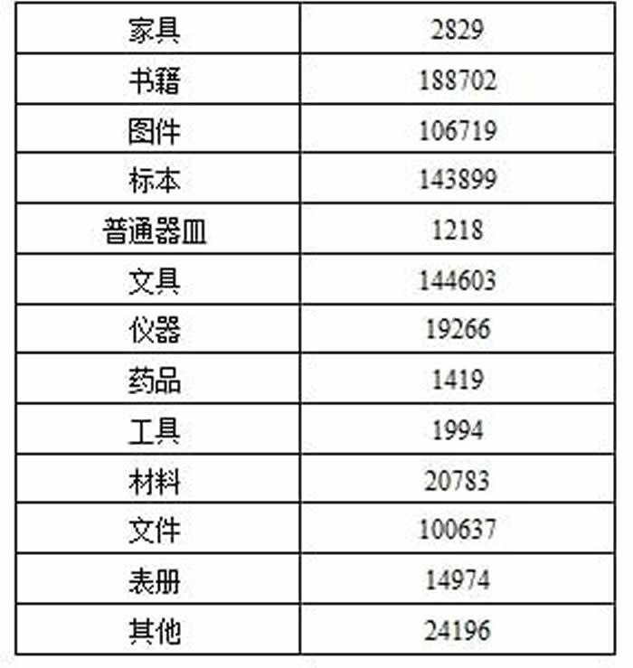 全体参加清点工作的有111人,共编为18个小组(其中清点图书馆的有4个小组)和4个特别小组(油印、快报等),于6月3日开始清点造册。此次清点工作,不仅摸清了家底,而且在工友宿舍的破箱子里面意外发现了20世纪20年代斯文·赫定调查蒙古、新疆时的手稿及一些测量记录等;叶连俊、关士聪、何春荪等在甘肃采集的标本一箱;葛利普校阅过而未付印的古生物誌稿一本等珍贵的材料。至6月11日,除图书馆外清点工作均已进入造册缮写及总结阶段,至7月1日全部清册编造完毕,7月8日所有物资清点完毕后举行了清点总结大会。这次清点工作获得的物品分类数目见表1(《中地快报》第34号,档案S005-00010-034)。