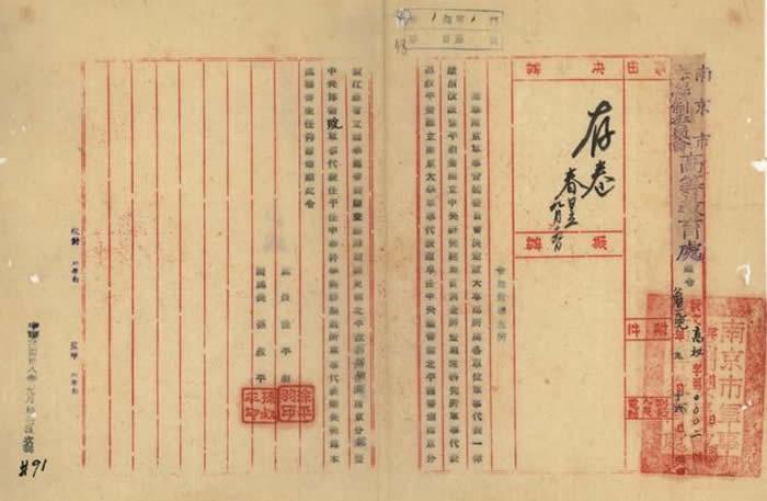 9月15日,中央地质调查所收到通知,原南京市军事管制委员会文化教育委员会大专教育处奉命改组为南京市军事管制委员会高等教育处(简称南京市军管会高教处),徐平羽为高教处处长、孙叔平为副处长。自当天起,高等教育处仍派潘廓祥为所军事代表的联络员。9月17日,中央地质调查所收到通知(图2,档案S005-00013-038),“案奉南京军事管制委员会决定,原大专部所属各单位军事代表一律撤销,改派徐平羽兼国立中央研究院地质调查所暨地理研究所军事代表,孙叔平兼国立南京大学军事代表,赵卓任中央图书馆、北平图书馆南京分馆、江苏省立国学图书馆、国立翻译馆、国史馆、北平故宫博物院南京分院暨中央博物院军事代表,任干任中华科学仪器制造所军事代表,乐长明为本处秘书主任,仰即知照此令”。虽然此通知中将中央地质调查所的隶属关系搞错了,但可以看出,南京市军管会派驻中央地质调查所的军事代表已从4月底的赵卓变更为9月中旬开始的徐平羽。