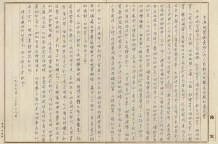 随后的一些记录或者事情,也事实上表明中国科学院已经在考虑中央地质调查所的工作安排了。例如,11月26日的所务会议记录(档案S005-00005-020)提及“科学院来信着我们依据实际情形开列拟购学术书刊清单”,议决“请各室于下星期内开列书单送图书馆汇办”。中央地质调查所将来可能归属中国科学院一事,正在接管中央地质调查所的南京市军管会应该也是知情的,例如1949年11月27日,南京市军管会高教处在回复地质调查所的一封函件中,曾写道:“十月廿七日来文除有数点于十一月二日来文批复外,其余数点批复如次:1. 职工待遇,原则上应与中研院一律,最好待科学院接收后统筹办理。……”。从中可以看出,11月下旬,高教处应该已经知道中国科学院有意要接收中央地质调查所了。另外一个佐证是12月12日所务会议记录“高教处转来中国科学院函限本月廿日以前拟具本所一九五〇年度工作计划迳送该院——决议由各室馆拟具计划后于十七日以前送交文书科汇办”。
