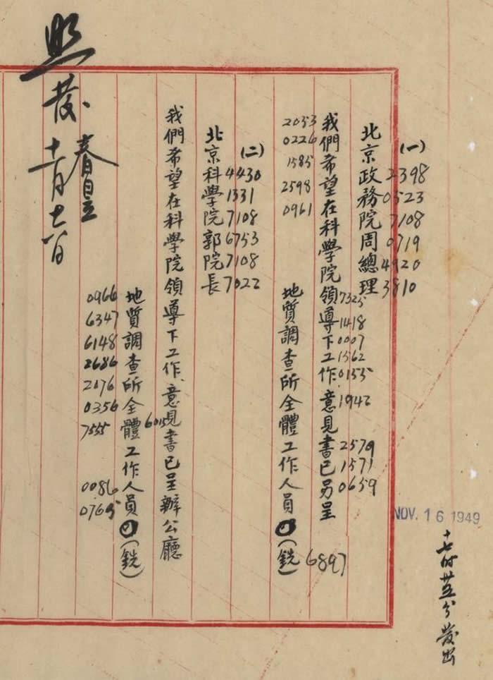 11月15日,李春昱所长草拟一份致政务院周恩来总理的函:“恩来先生:我们是地质调查所的工作人员,对于本所隶属问题,有一个意见,兹谨缮具意见书一份奉上,敬请参考”(档案S005-00008-001-002)。11月16日17时35分,李春昱所长又签发两份电报(图7,档案S005-00008-001-001):1)致政务院周恩来总理,其内容是“我们希望在科学院领导下工作,意见书已另呈”;2)致中国科学院郭沫若院长,其内容是“我们希望在科学院领导下工作,意见书已呈办公厅”。两份电报的落款均为“地质调查所全体工作人员(铣)”。