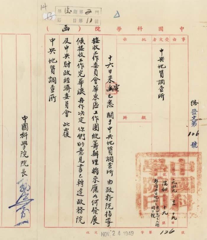 1949年10月31日,中华人民共和国中央人民政府毛泽东主席向郭沫若院长颁发中国科学院铜质印信。11月1日,中国科学院正式对外办公。1949年11月~1950年4月,中国科学院陆续接收原中央研究院、北平研究院和静生生物调查所等科研机构,经过整合重组,于1950年6月成立了第一批15个研究机构和3个研究所筹备处。但关于中央地质调查所的隶属问题,一直未有定论。