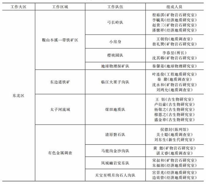 1950年4月初,遵照中央人民政府政务院财政经济委员会核定的地质矿产调查计划,中央地质调查所、矿产测勘处、北京地质调查所等南京北京的机构组成的地质工作人员和测量人员到达沈阳,会同在东北的地质测量人员,组织了东北地质矿产调查队,李春昱任总队长。经过五个多月的野外测量、调查和探勘,于9月25~28日在沈阳举行了一个总结会议。李春昱总队长报告东北地质矿产调查队包括地质工作人员84人,其中有中央地质调查所的26人(表2);物理探矿工作人员21人,包括中央地质调查所的人员;此外还包括测量人员105人、事务人员3人、钻探人员80余人、临时槽探工人600余人(东北区地质矿产调查队,1950)。此次野外工作是中国地质界第一次大规模的系统配合工作模式,有地形测量、地质调查、物理探矿、钻探槽探以至开采,取得了不少的收获。中央地质调查所在南京的另一部分地质人员则分赴全国各地,担任紧急的地质矿产和重点工程地质调查工作,冬季收队回所又开展了大量的室内分析、总结工作。