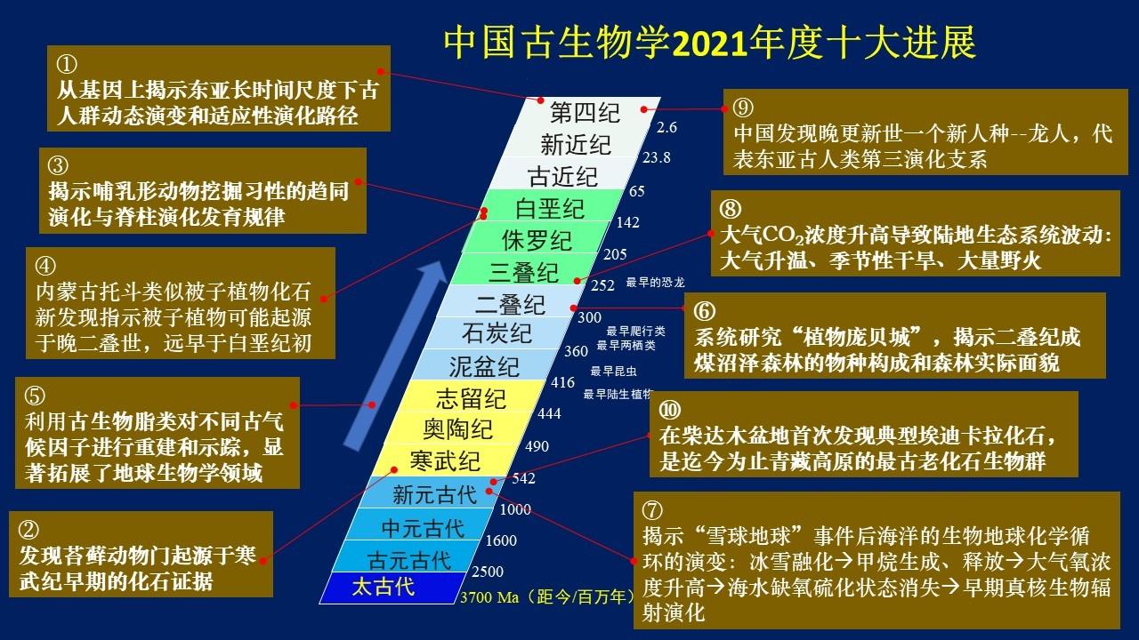 本次入选十大进展的成果包括:1)解锁东亚长时间尺度下古人群动态演变和适应性基因演化;2)化石证据揭示苔藓动物门起源于寒武纪早期;3)热河哺乳形动物的挖掘趋同演化与脊柱的演化发育意义;4)内蒙古早白垩世新化石揭示被子植物起源之谜;5)古生物脂类对不同古气候因子的重建和示踪;6)晚古生代化石宝库“植物庞贝城”系统研究;7)雪球地球冰期结束后全球古海洋环境的精细刻画;8)古-中生代之交大气CO2浓度升高与陆地生态系统扰动;9)中国发现晚更新世一个新人种:龙人及其独立第三演化支序;10)青藏高原柴达木盆地典型埃迪卡拉化石的发现及其古地理意义。