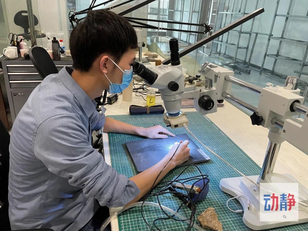戴上口罩、打开显微镜,聚光灯下,李周强手中的气动笔飞速振动,笔尖发出的轻微“咝咝”声如同一个个音符,在他手中演奏出一曲动听的旋律。“这是一个胡氏贵州龙,它的头已经是修复好了的,可以看到和其他部位比较,更加立体。受大小、骨骼等不同因素影响,修复一块贵州龙化石要花十至二十天时间。”