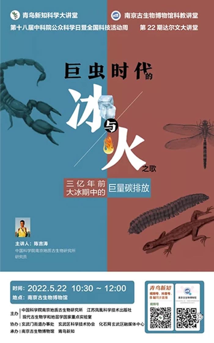 5月22日10:30——12:00,中科院南京地质古生物研究所研究员陈吉涛将带来《巨虫时代的冰与火之歌——三亿年前大冰期中的巨量碳排放》主题演讲。届时,感兴趣的公众可通过南京古生物博物馆B站号进行观看。