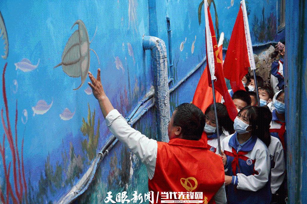 走进八郎村,村庄房屋的墙壁上通过彩绘的形式画满了各种长相奇特的古生物画像,奇虾、三叶虫、海百合……种类繁多的古生物加上刘锋生动的讲解,让学生们不断沉浸在科普的海洋中。