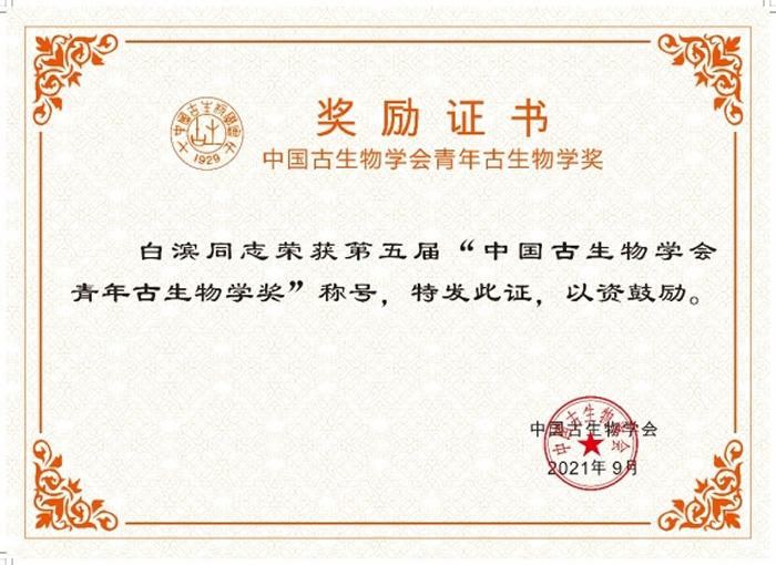 古脊椎所白滨研究员获颁中国古生物学会“第五届青年古生物学奖”