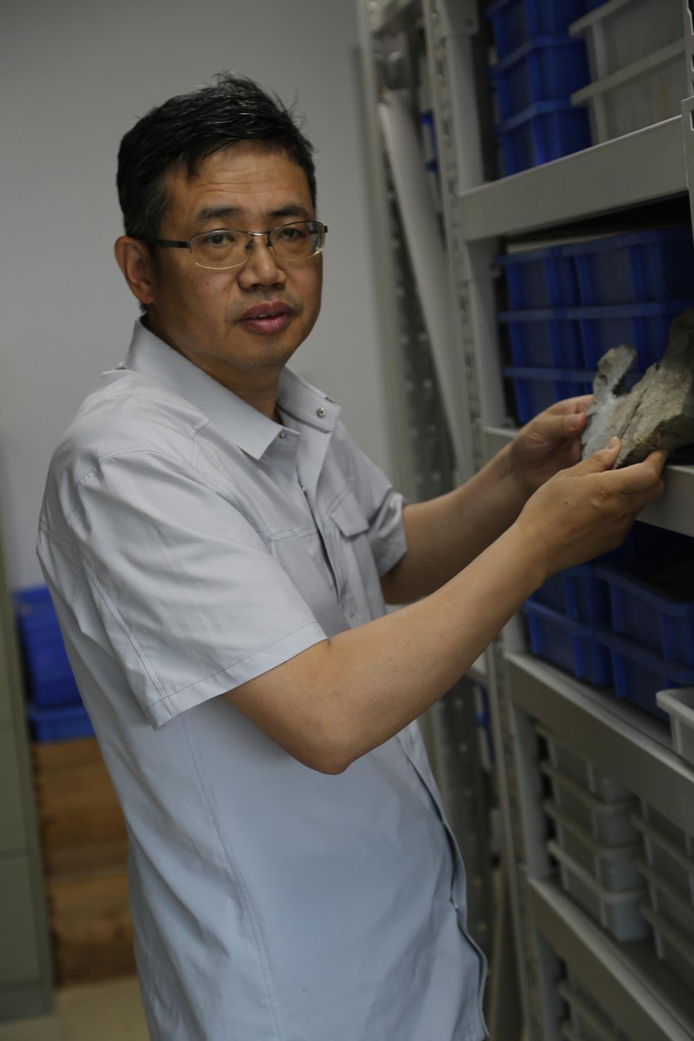 2022年,朱敏在办公室里查看化石。受访者供图