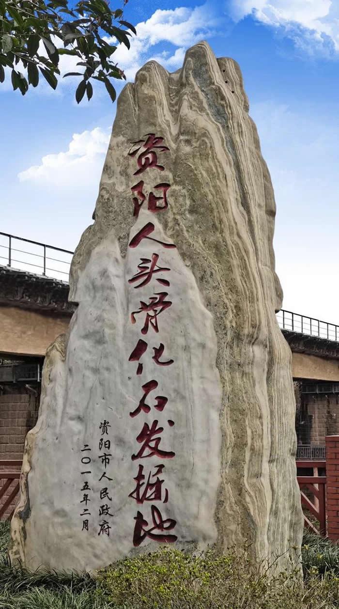 1951年3月,在成渝铁路资阳黄缮溪(现九曲河)铁路桥一号桥墩基坑里,发掘出一块古人类头骨化石,距今约35000年,考古学界命名为“资阳人”,为研究人类起源和旧石器时代人类分布提供了宝贵资料。目前,遗址处已树立一块石质大碑,刻有红色大字“资阳人头骨化石发掘地”。