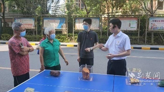 雌黄、黄铁矿、孔雀石、恐龙蛋······活动现场,湖北地质工作者将湖北地质博物馆的展品移到社区,得知消息的居民纷纷前来参观。