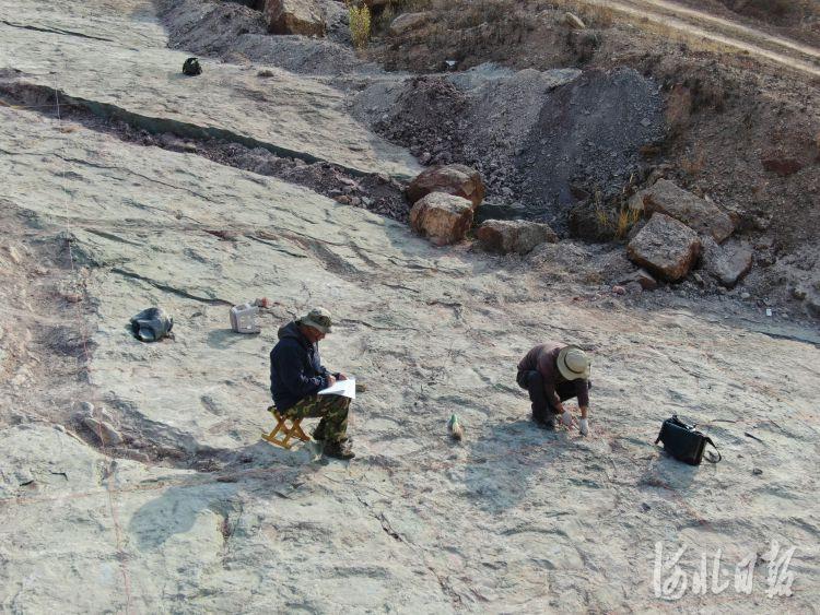 省区域地质调查院工作人员正在对宣化恐龙足迹进行数据测量。 周明兴摄
