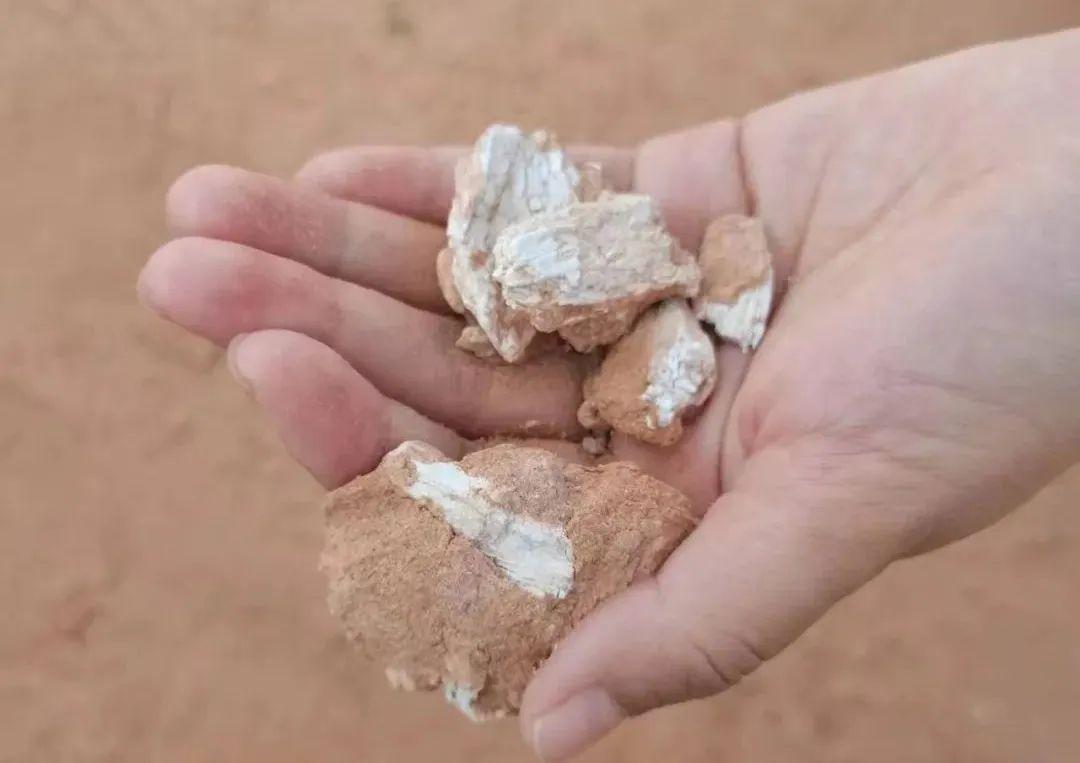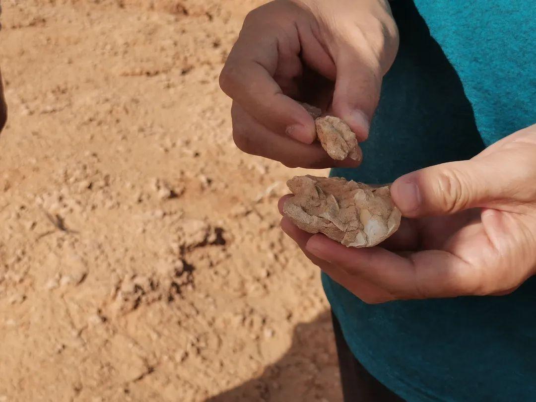 考察中发现了大量恐龙化石碎片,根据骨骼形态初步判断为原角龙化石碎片。原角龙是生活在亚洲的白垩纪草食恐龙,体重40到180公斤,身长3米。