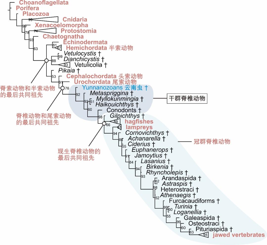 脊索动物包括头索动物、尾索动物和脊椎动物。分子系统发生研究表明,脊椎动物和尾索动物之间的关系最近,而头索动物属于脊索动物中最早分异出来的一支 [18]。将前面提到的冠群、干群的概念应用到脊椎动物起源的问题中,可以看出脊椎动物的冠群包括现生的圆口纲和有颌类。而脊椎动物的干群,则包括在脊椎动物总群支系上、位于脊椎动物和尾索动物最后共同祖先和冠群脊椎动物之间的所有已绝灭类群(图2)。“论文” 通过系统发生分析揭示,云南虫类的演化位置处于脊椎动物的干群之中,并且是目前已知分异最早的脊椎动物干群支系(图2)。“论文” 从未将半索动物、头索动物或尾索动物称为脊椎动物。
