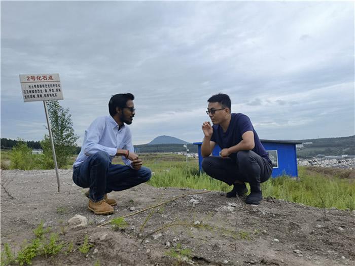 中科院博士张立召(右)与博士保罗(左)在延吉龙山化石地点开展考察研究工作