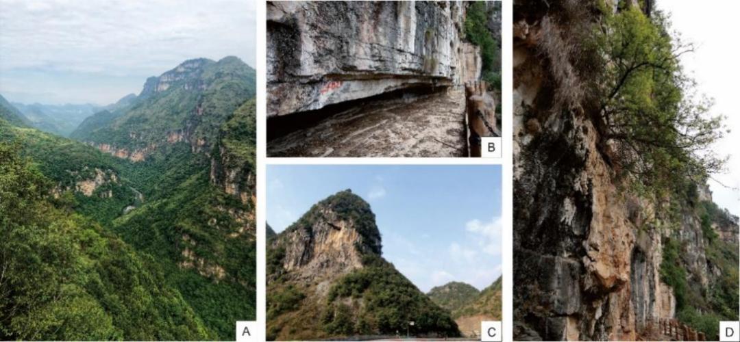 马岭河探险步道岩溶地貌 A马岭河白云岩峰丛 B白云岩差异风化 C冠岩,基座为白云岩 D钙华