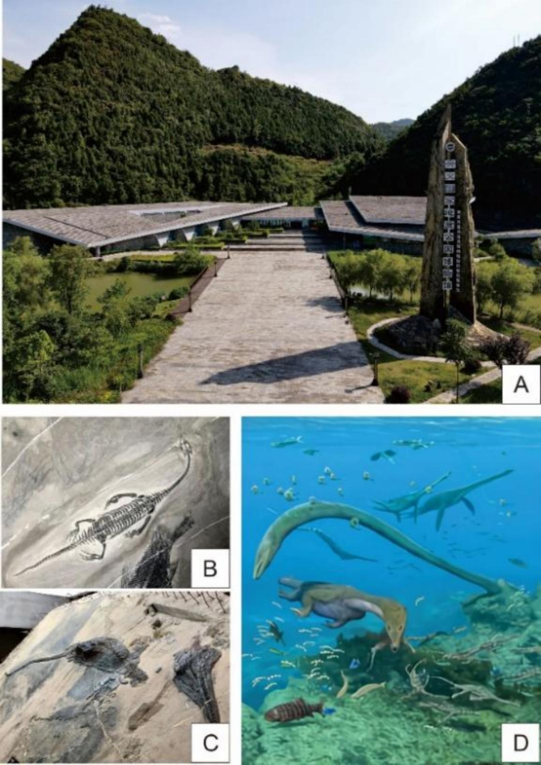 兴义国家地质公园博物馆及兴义生物群 A博物馆外景 B贵州龙化石 C贵州鱼龙 D兴义生物群复原