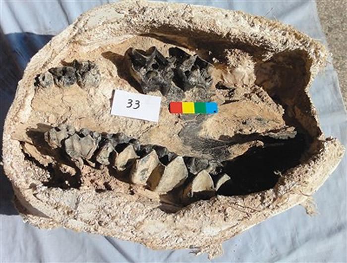 在四子王国家地质公园展出的脑木更地区出土的大型哺乳动物颌骨化石。(杨孝 摄)(本版照片除署名外,均由四子王旗地质公园服务中心提供)