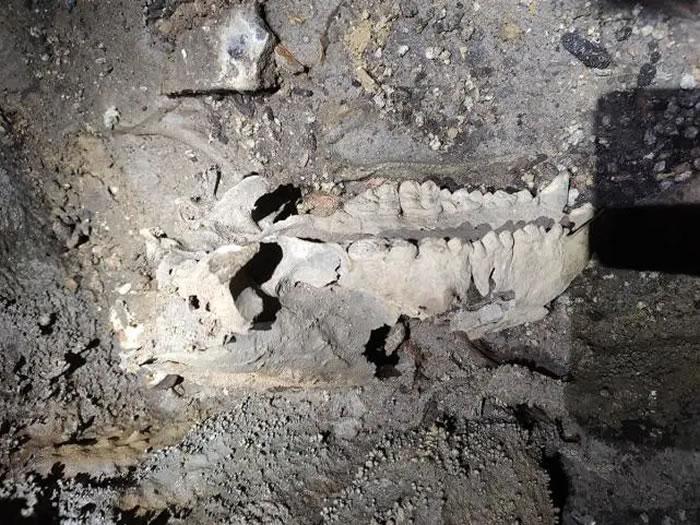 “洞穴很深,我们垂降了大概130米才到底部。”张国强说,他们来到洞底后,又横向上坡行走了数十米,在穿过一个仅容人侧身爬过的缝隙后,发现洞内除了一个空旷的小厅外别无其它,便折身准备离开,返回途中在缝隙附近发现了一堆动物骨头,下颌骨清晰可见。